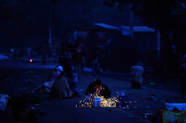 A roadside tea vendor warms his kettle on a stretch of road near the Indian Parliament, in New Delhi.